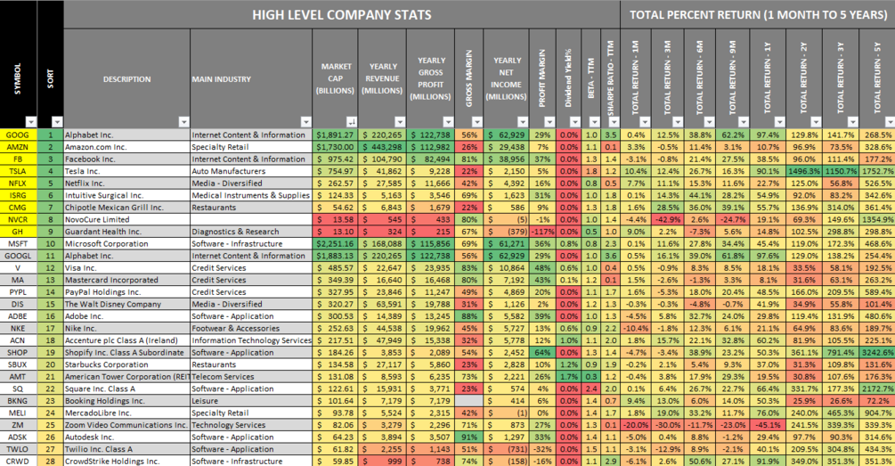 Additionally, each of the 50 companies has a 1-page dashboard that includes charts, KPIs, metrics, income statement, and the balance sheet.